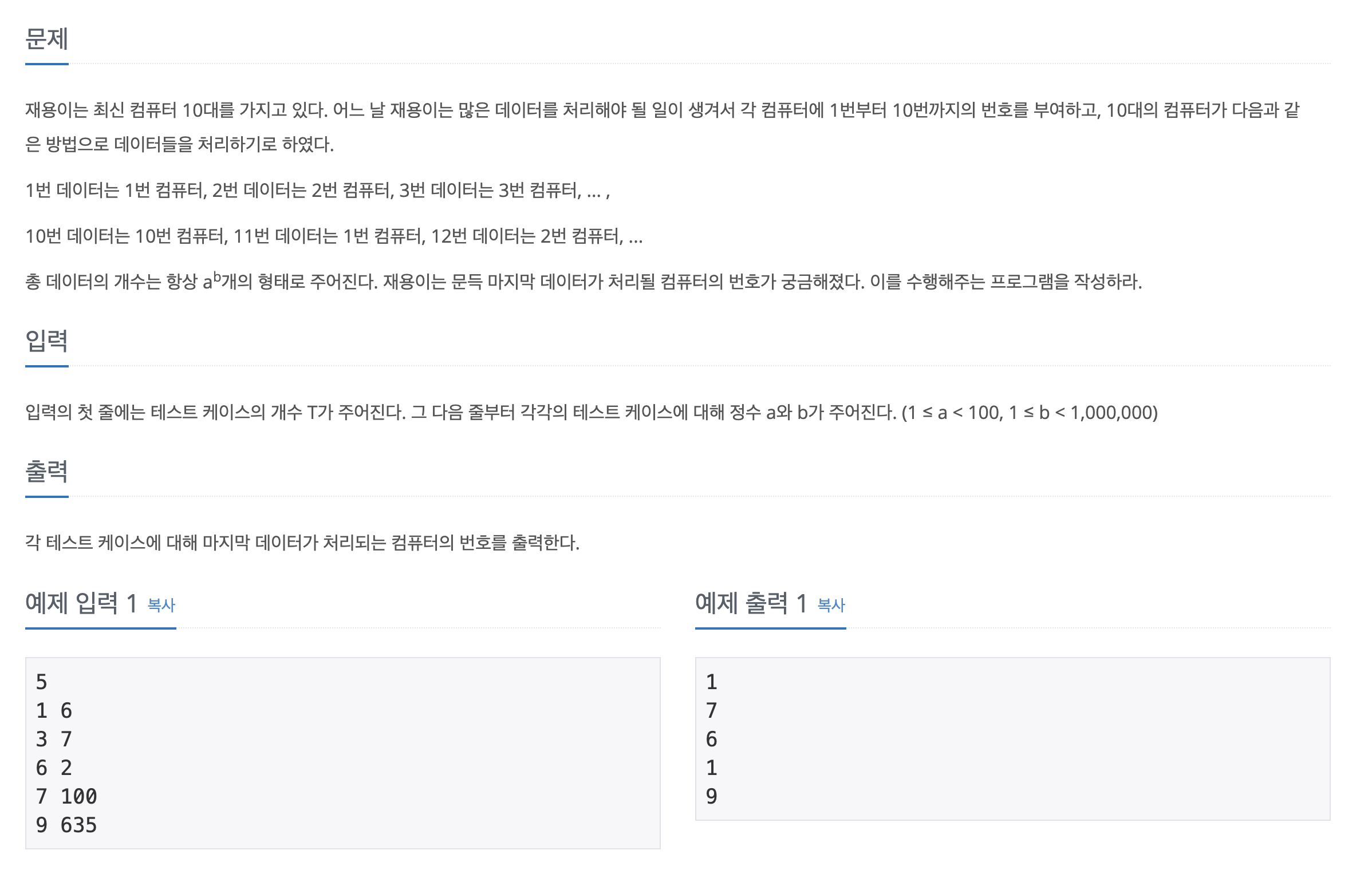 1. a 제곱 b의 값을 나누기 10해서 맨뒤에 값을 구해봤다.