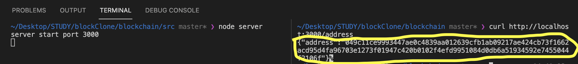 이렇게 한 후 서버 실행시키고 curl로 http://localhost:3000/address를 확인해 보면 키 값을 볼 수 있다.