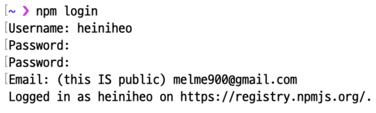 로컬 더미널에서 npm login 을 쳐서 username, password, email을 차례대로 입력하여 로그인한다.