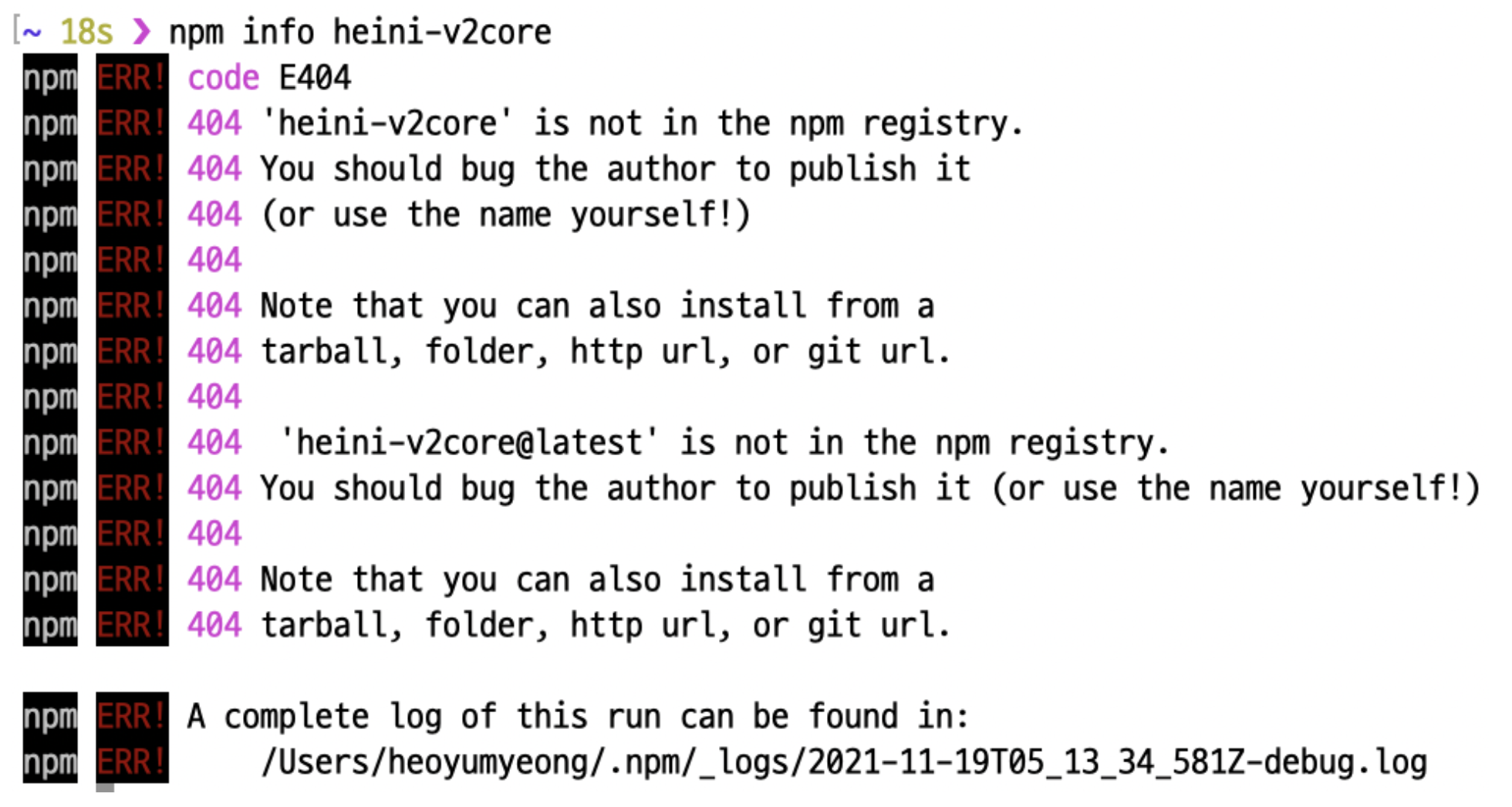 npm에 로그인 되어 있는 상태에서 npm info [패키지명] 을 입력하여 내가 생성하려는 패키지명이 이미 존재하는지 확인한다.