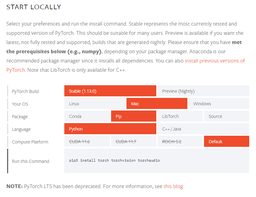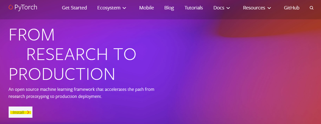 파이토치 공식 사이트로 들어가서 보이는 Install 버튼을 누른다.
