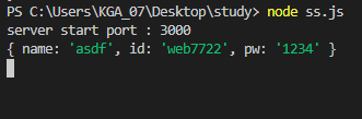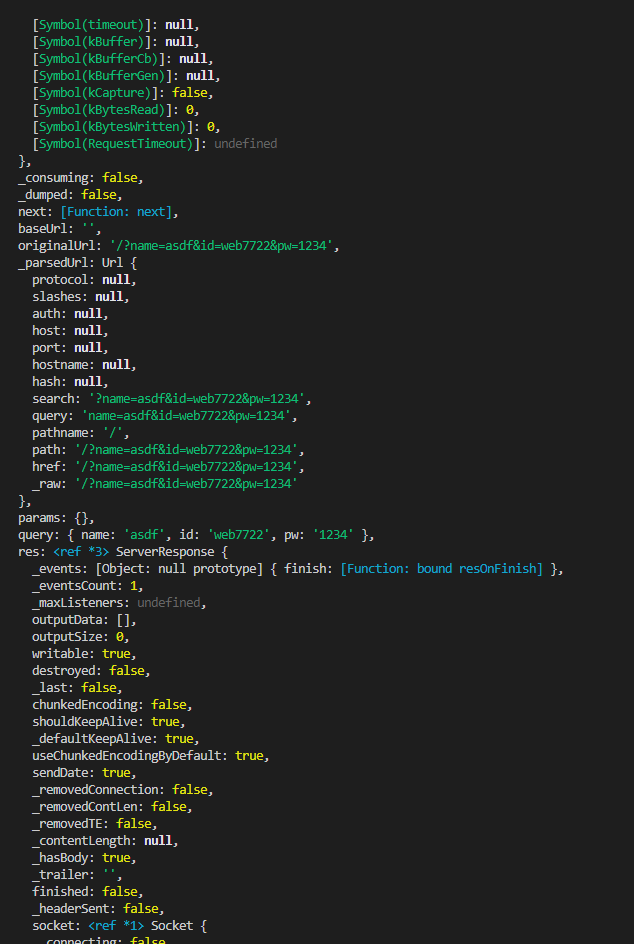 서버를 http://localhost:3000/?name=asdf&id=web7722&pw=1234 <<이렇게 열어서 request 값을 입력해준다.