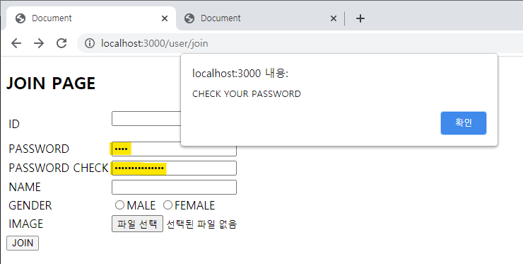 일부러 password를 다르게 입력한뒤 join버튼을 눌러본 결과