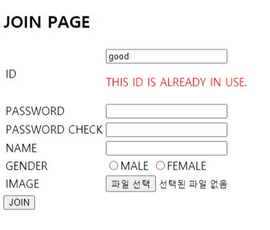 GOAL : 아이디를 입력하고 다음 커서로 넘어갔을때(focusout) 그 아이디가 이미 database에 있는 아이디인지 아닌지 구분하고 box아래 메세지를 표출하는 것.